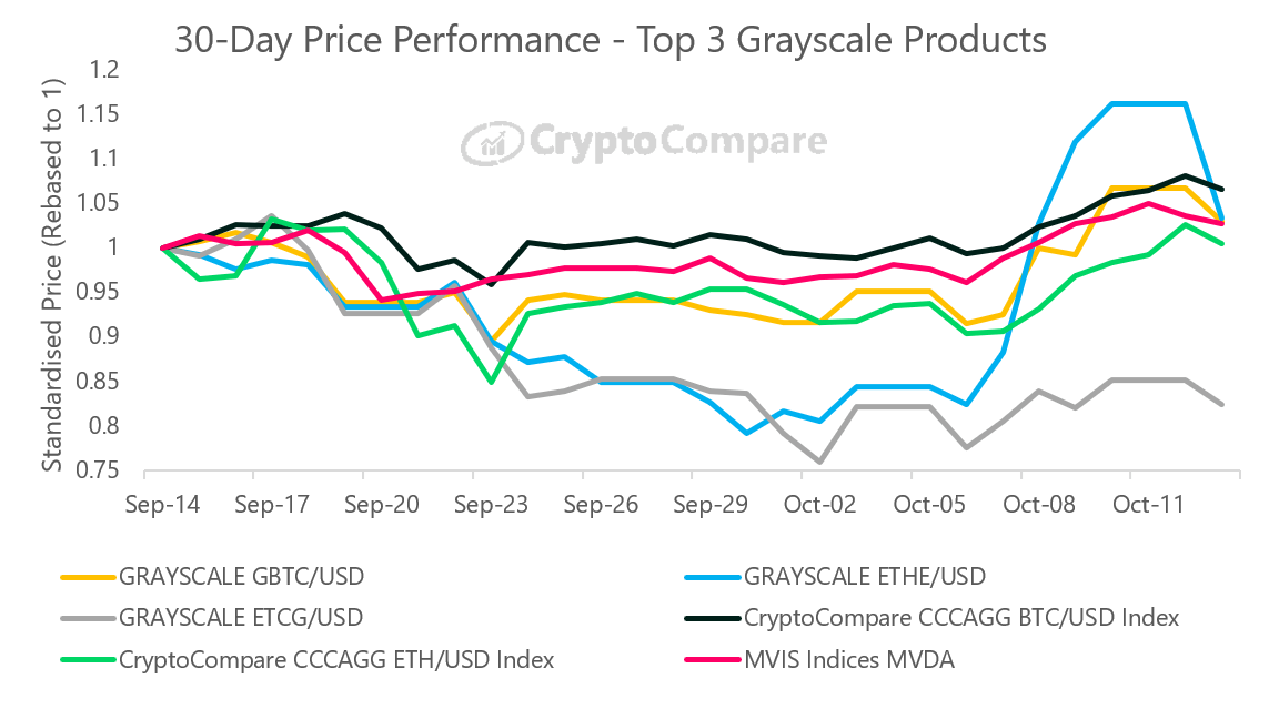 Meanwhile, Grayscale’s over-the-counter offerings GDLC and ETCG experienced the largest 30-day losses in value among the top-traded ETPs at -19.9% and -17.6% respectively. “Grayscale’s products generally underperformed compared to the market,” the report said.