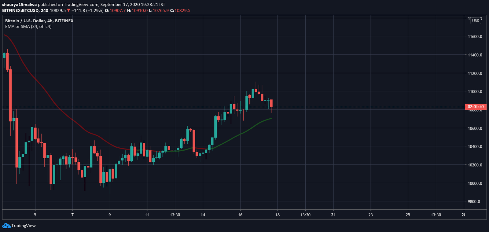 At press time, Bitcoin trades at $10,900 and is continuing its short-term uptrend. The asset trades about its 34-period exponential moving average and has local support in the $10,500-$10,600 price range.