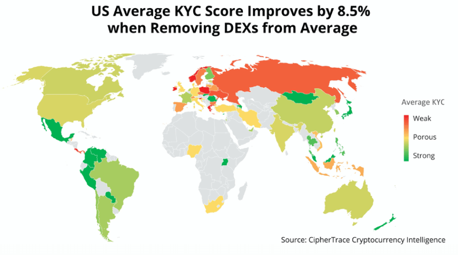 Researchers found that over 90% of DEXs with a clearly domiciled country had deficient KYC, with 81% having little to no KYC whatsoever. This, according to some regulators, maybe a “compliance violation, despite their decentralized nature.”