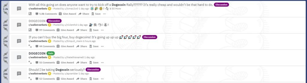 Below is a screenshot of WallStreetBets’ recent mentions of Dogecoin. They are aiming of buying the cryptocurrency en-masse to trigger a similar move to what has been seen with Gamestop.