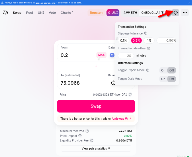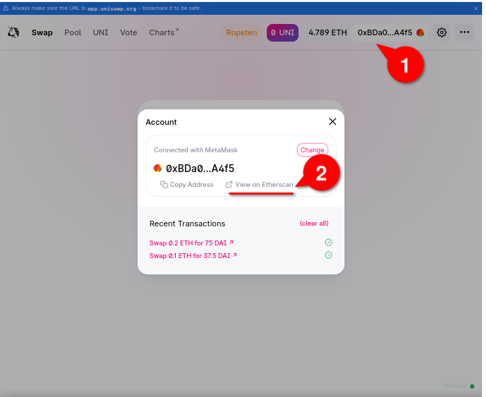 The fastest way to check your transaction is to click on your address in Uniswap’s toolbar (1) and then click on “View on Etherscan” (2).