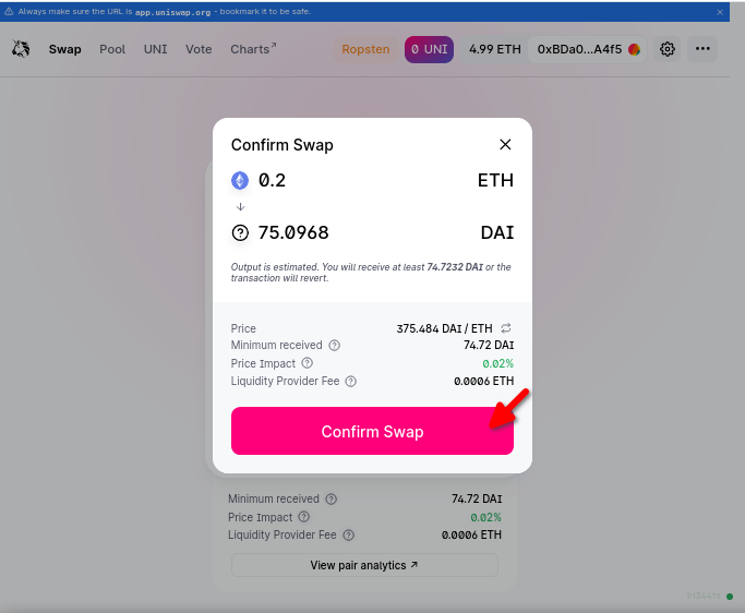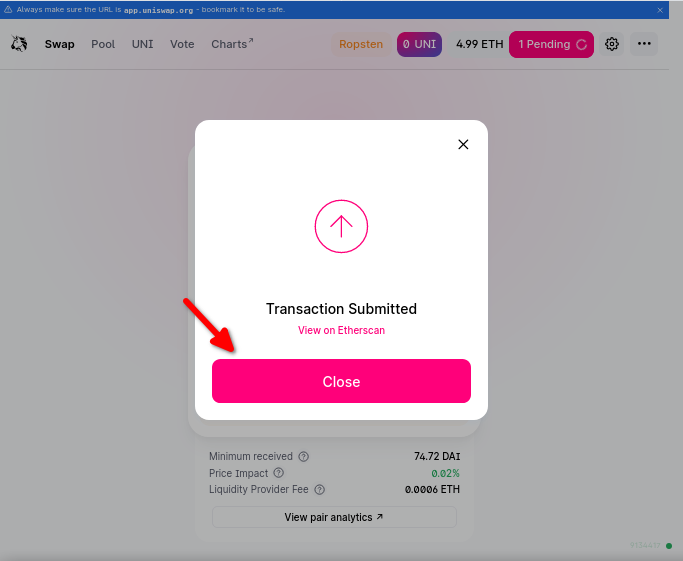 Wait for Uniswap to approve your transaction. When other traders use your pool, you will earn interest. You can check the status of your pool on the Pool page.
