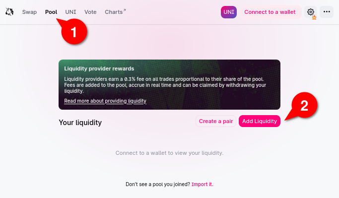 As noted earlier, you can earn interest by depositing cryptocurrency in Uniswap’s liquidity pools. To do so, click on “Pool” in Uniswap’s main toolbar (1), then click on “Add Liquidity” (2).