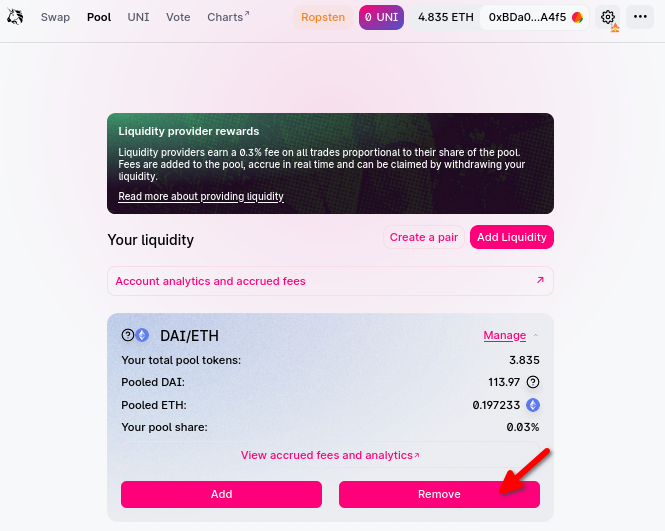 Click “Remove” to proceed with the withdrawal. (Alternatively, you can add more funds to generate more income.)