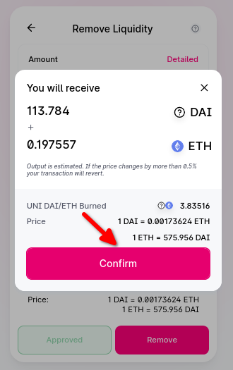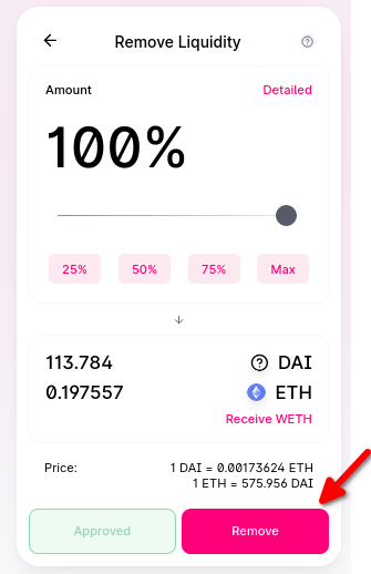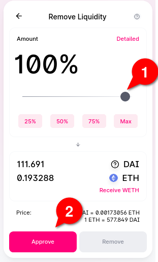 Choose the amount of funds that you want to remove by sliding the bar (1). In this example, we’ll remove all of the DAI we staked earlier.