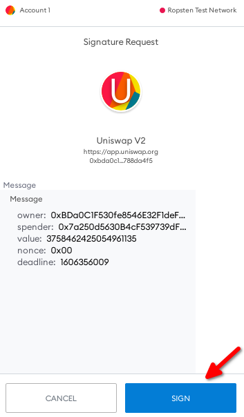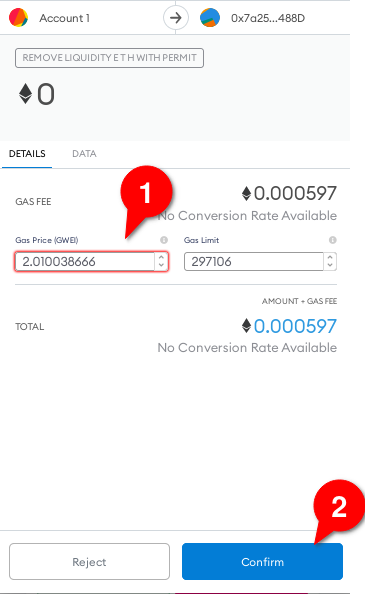 Next, confirm the details of the swap in your Metamask wallet. Enter a gas price and gas limit (1). Higher values will make your transaction go faster.
