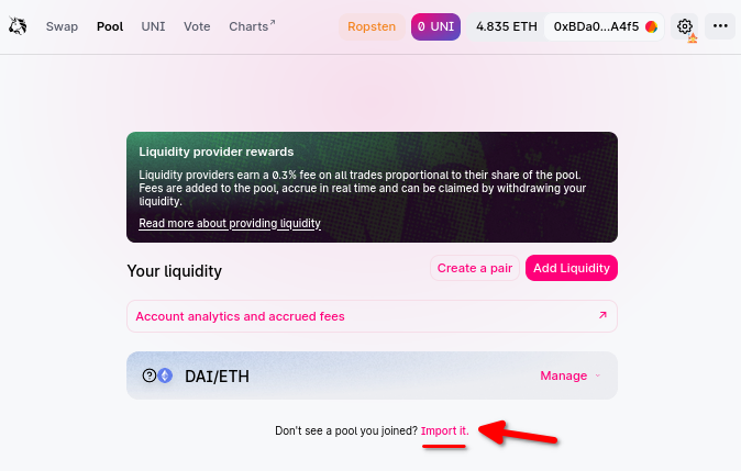 If it does not show up, restore it by clicking on “Import” on Uniswap’s Pool page.