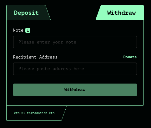 You can then enter the note you saved when you made the deposit, as well as your withdrawal address.