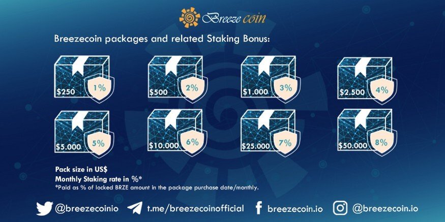 Users can earn by locking away Breezecoin for a certain period of time (of 6 months), investors will get a guaranteed monthly interest (up to 8%, depending on the Package).