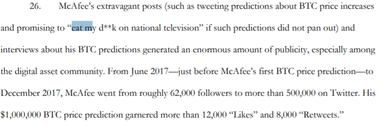 McAfee’s infamous “eat my d***” comment in 2017, where the entrepreneur infamously said Bitcoin would reach $1 million by 2020 and eat his own d*** if not, was flagged by the SEC in the court documents, as the below image shows: